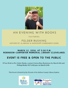 The Friends of the Bolivar County Library System (“Friends”) host several Evening With Books author visits each year at the Robinson-Carpenter Memorial Library in Cleveland. All upcoming author visits hosted by the Friends will be advertised with flyers at the library, on the BCLS Facebook page, and on this page.